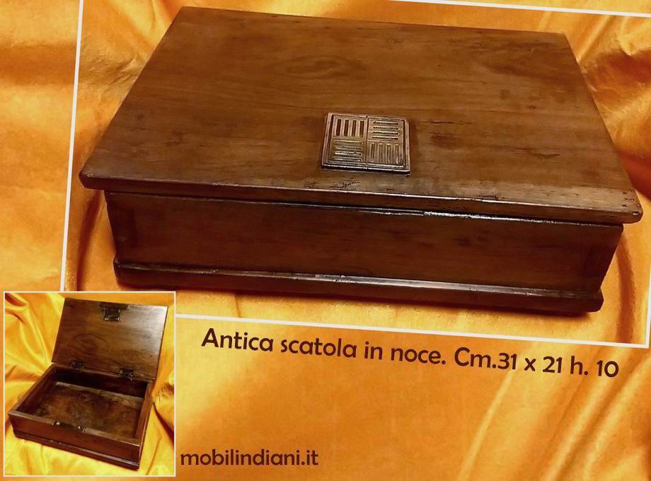 Disponibilità 1Scatola portagioie antica, di forma rettangolare in legno di noce con placchetta sul coperchio. Anni '50 Priva di serratura, con una bella patina compatibili con la datazione. Oggetto restaurato. Cm.31x20 h.10. Provenienza Italia COSTO TRASPORTO €. 35,38 Iva Inclusa. Per costi trasporto Isole, chiedi info su WhatsApp o mail: info@mobilindiani.it