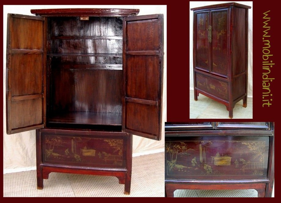 SCONTO SE ACQUISTI IN NEGOZIO. Armadio cinese antico laccato, essenza naturale, caratterizzato da elementi decorativi oro. Cm.98x50 h.181 Interno due ripiani e un vano "botola segreta" molto capiente (vedi foto) Legno olmo. Paese Wenzhou, Sud Cina. PER COSTI SPEDIZIONE CHIEDI su WhatsApp o via mail: info@mobilindiani.it
