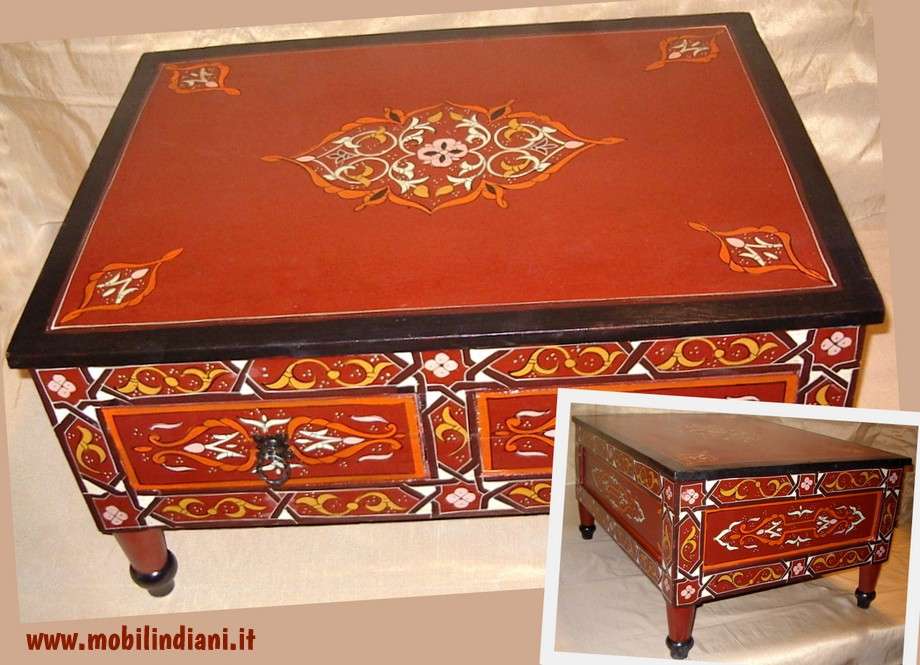 Disponibilità 1PIANO ROVINATO (vedi foto) Tavolino arabo del Marocco in legno dipinto con due cassetti, dipinto a mano con motivi berberi, colore del fondo rosso mattone. Cm.80x60 h.40 Paese Marrakech, Marocco RITIRO PRESSO NS. SEDE COSTO ZERO. Per info chiedi su WhatsApp o mail: info@mobilindiani.it