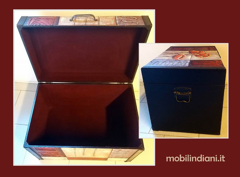 Baule contenitore orientale in legno, con decorazioni astratte a rilievo. Design moderno con colori che variano dal rosso-bordò al beige e marrone, con accenti neri. Maniglie in ferro e Interno foderato (vedi foto) Cm.60x40 h.41 Paese Indonesia PER INFO COSTI SPEDIZIONE CHIEDI su WhatsApp o via mail: info@mobilindiani.it