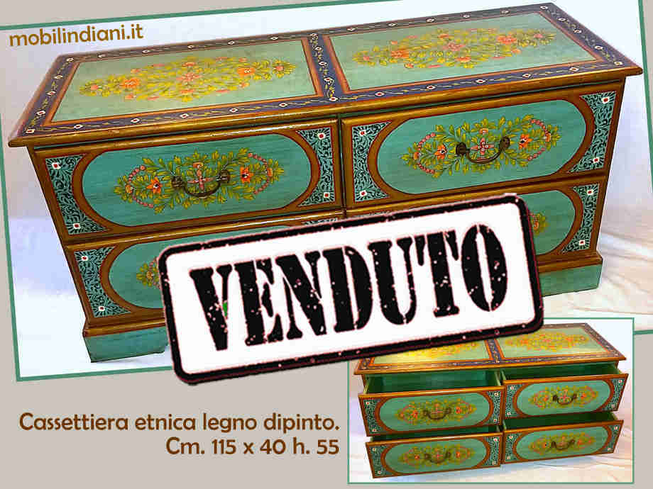 Disponibilità 0Mobile etnico dipinto su tutti i lati (vedi foto) con 4 cassetti capienti. Cm.115x40 h.55 Legno palissandro. Paese India
