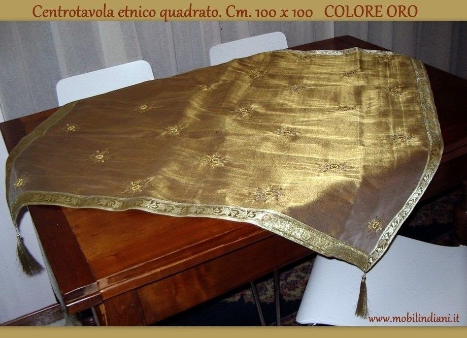 Disponibilità 1Centro tavola quadrato colore oro, bordato con passamaneria. Cm.100x100 con fiocchetti. Paese India. COSTO TRASPORTO €. 8,80 Iva Inclusa