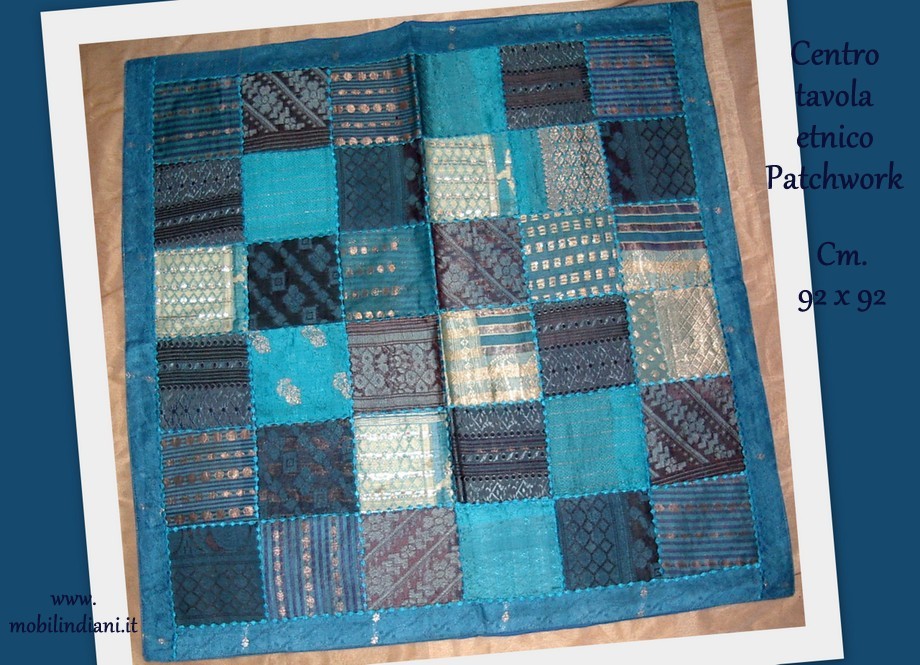 Disponibilità 1Copritavolo indiano patchwork. Realizzato a mano con tessuti indiani dal particolare effetto cangiante. Foderato sul retro. Origine Rajasthan, India. Cm.92x92 COSTO TRASPORTO €. 8,80 Iva Inclusa