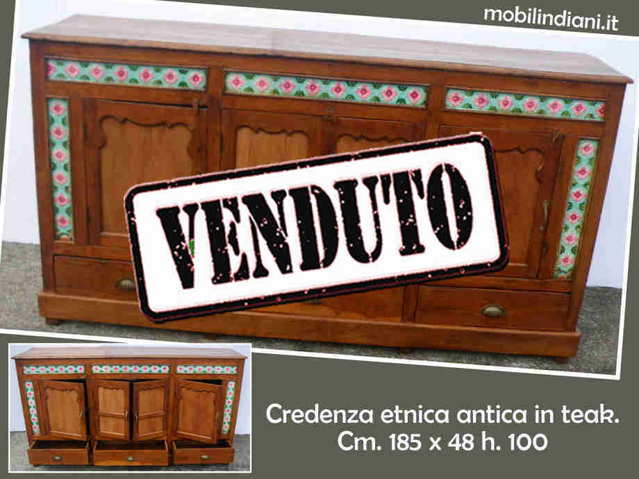 Disponibilità 0Credenza indiana antica in splendido legno di teak con mattonelle in ceramica, completamente restaurata in Italia. Cm.185x48 h.100 Paese Rajasthan, India