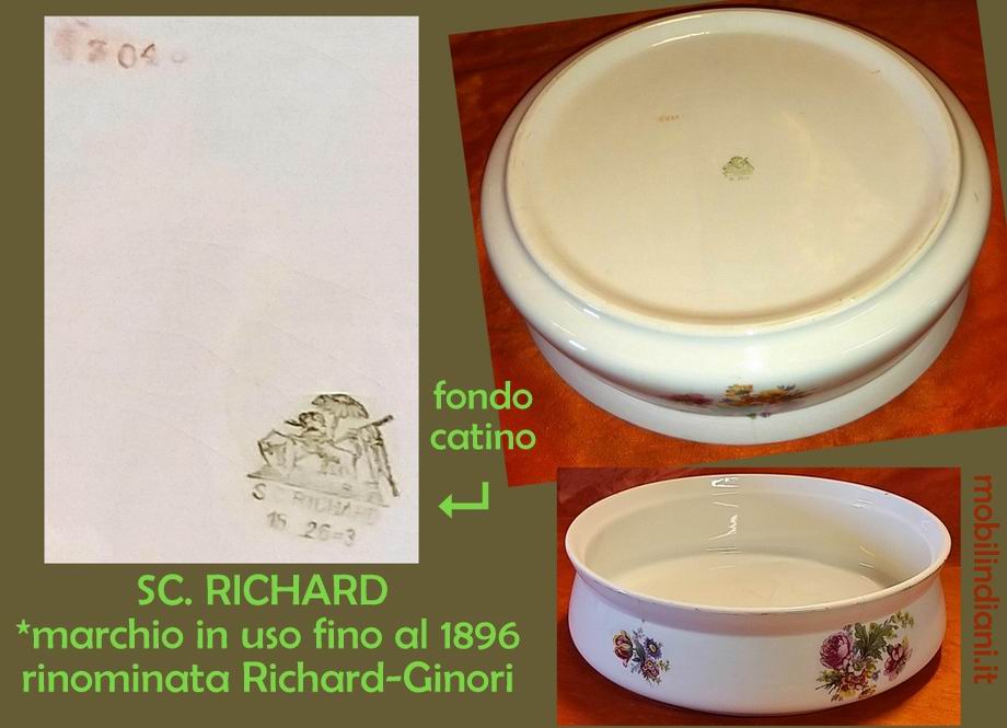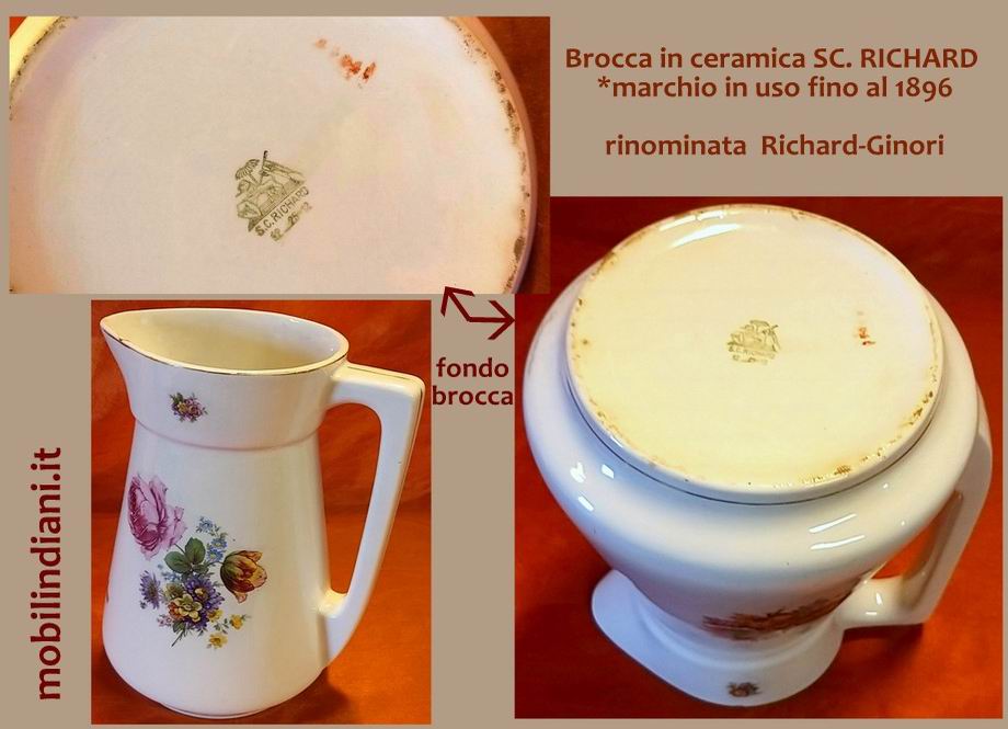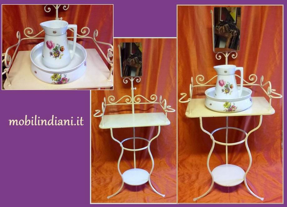 Lavabo con catino e brocca. Antico e originale treppiedi in ferro battuto in elegante stile Liberty. Catino e brocca in ceramica bianca con decori oro. SC. RICHARD (marchio in uso fino al 1896) poi Richard Ginori. *Presenti segni del tempo. Misure in cm: Catino; diam.36 h.12 - Brocca; diam.20 h.30 - Piano; 65x40 h.79 - Specchio; 22x33 altezza regolabile. RITIRO PRESSO NS. SEDE COSTO ZERO - Per info chiedi su WhatsApp o mail: info@mobilindiani.it