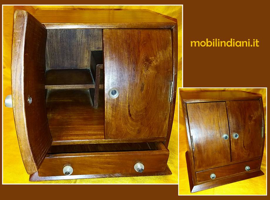 Particolare mobiletto indiano con antine bombate e cassetto. E' in legno massello di sheesham (noce) dal colore caldo mielato. Le manigliette sono in vetro opale. Cm.largh.30 prof.26 alt.30,5 Paese India. COSTO TRASPORTO €. 29,00 Iva Inclusa. Per costi trasporto Isole, chiedi info su WhatsApp o mail: info@mobilindiani.it