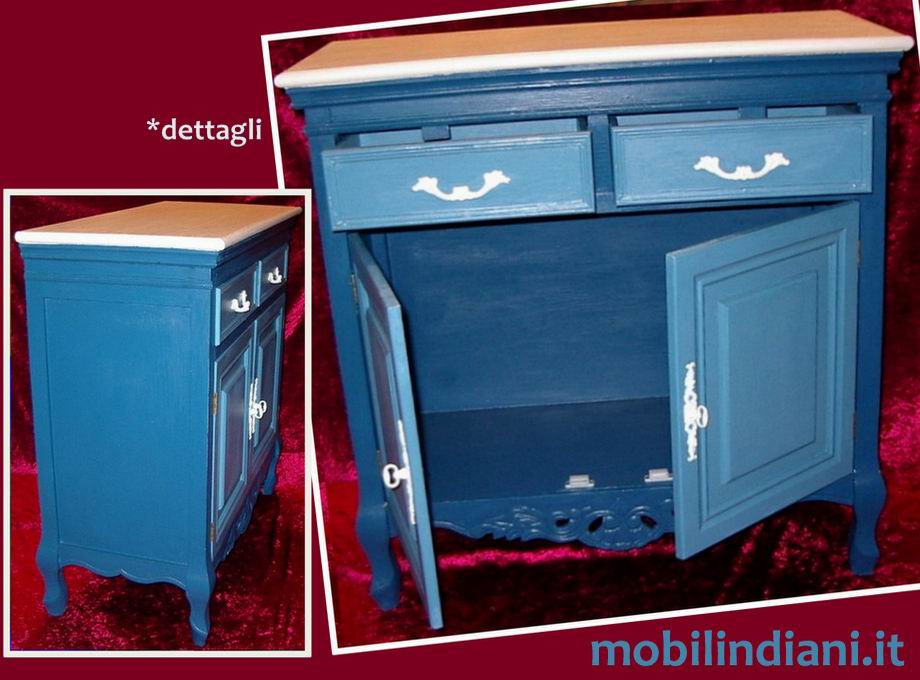 Mobili seconda casa. Mobiletto in legno dipinto 2/cass 2/ante, maniglie in metallo colore bianco. Finitura blu, avorio e color jeans, stile retrò. Cm.78x36 h.80 Paese Italia. RITIRO PRESSO NS. SEDE COSTO ZERO - Per info chiedi su WhatsApp o mail: info@mobilindiani.it.