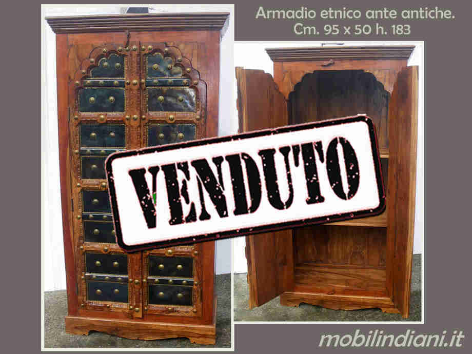 Disponibilità 0Armadio etnico con ante antiche intagliate, rivestite in ferro con borchie in ottone. Tutto in sheesham (noce) massello, compreso il fondo, vedi foto. Cm.95x50 h.183 Paese Rajasthan, India