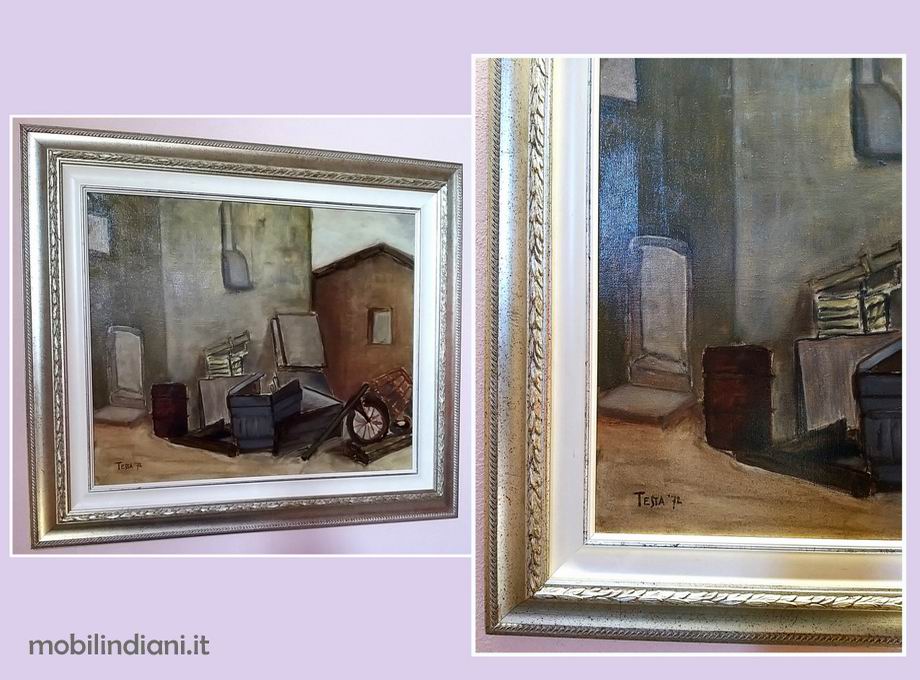 Disponibilità 1Quadro olio su tela con cornice in legno con passe-partout. Anno 1972 Mis. cm. 80x70 SENZA VETRO Autore: TESTA COSTO TRASPORTO €. 19,95 Iva Inclusa. Per costi trasporto Isole, chiedi info su WhatsApp o mail: info@mobilindiani.it
