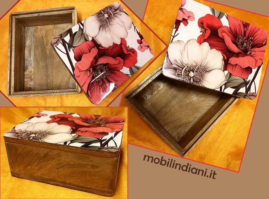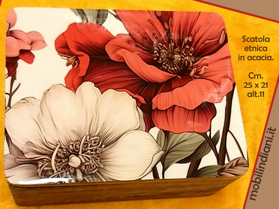 Box - bauletto indiano in legno acacia finitura a cera naturale, coperchio dipinto e laccato. Cm.21x25 h.11 Origine India COSTO TRASPORTO €. 12,81 Iva Inclusa. Per costi trasporto Isole, chiedi info su WhatsApp o mail: info@mobilindiani.it
