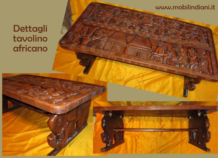 Disponibilità 1Tavolo tribale africano con intagli, piedi ad elefante. Realizzato in teak, tipico legno per la produzione di mobili africani. Cm.113x57 h.40 Origine Africa RITIRO PRESSO NS. SEDE COSTO ZERO - Per info chiedi su WhatsApp o mail: info@mobilindiani.it