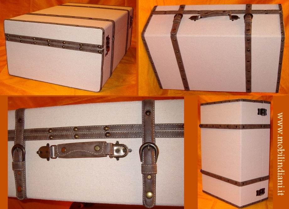 Disponibilità 3Elegante valigia stile vintage in legno rivestito con tessuto color avorio e foderata internamente sempre in tessuto. IDEALE PER CONSERVARE LA BIANCHERIA. Impreziosita da cinghie in eco-cuoio e rivetti color bronzo, chiusura con bottoni a clips. Cm.58x37 h.23 Paese Francia. COSTO TRASPORTO €. 29,00 iva inclusa. Per trasporto Isole invia mail a info@mobilindiani.it